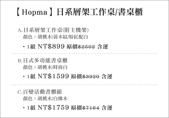 : 只要899元起(含運)即可購得【Hopma】原價最高7164元工作桌/書桌櫃系列1組:(A)日系層架工作桌(附主機架)/(B)日式多功能書桌櫃/(C)百變活動書櫃組,皆有多色任選!