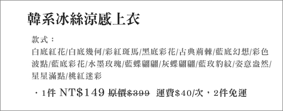 商品訊息簡述: 只要149元(2件免運)即可購得原價399元韓系冰絲涼感上衣1件,款式:白底紅花/白底幾何/彩紅斑馬/黑底彩花/古典荊棘/藍底幻想/彩色波點/藍底彩花/水墨玫瑰/藍蝶翩翩/灰蝶翩翩/藍玫豹紋/姿意盎然/星星滿點/桃紅迷彩。