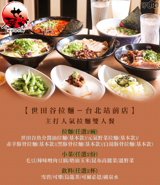 : 只要399元(雙人價)即可享用【世田谷拉麵《台北站前店》】原價770元主打人氣拉麵雙人餐:世田谷魚介醬油拉麵/元氣野菜拉麵/赤辛豚骨拉麵/黑豚骨拉麵/白湯豚骨拉麵(基本款拉麵任選2)+毛豆/辣味噌肉豆腐/奶油玉米/昆布高麗菜/溫野菜(小菜任選2)+雪碧/可樂/烏龍茶/可爾必思/礦泉水(飲料任選2)。